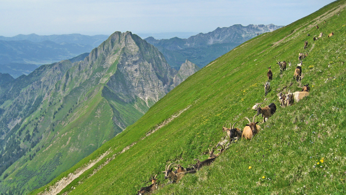 die Spezialisten für steiles Gelände - Geißen am Rauheck - im Hintergrund die Höfats