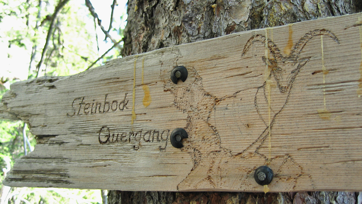 wer das 'Steinbock-Quergang-Schild' erreicht hat, hat orientierungstechnisch schon mal die meisten Schäfchen im Trockenen - einiges an Sucharbeit folgt bis zum Gipfel des Pilgerschrofens aber trotzdem noch