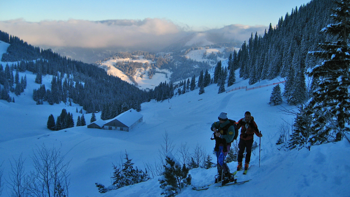 mit Charly und Robert unterwegs zum Ponten - im Hintergrund die Stuiben-Sennalpe