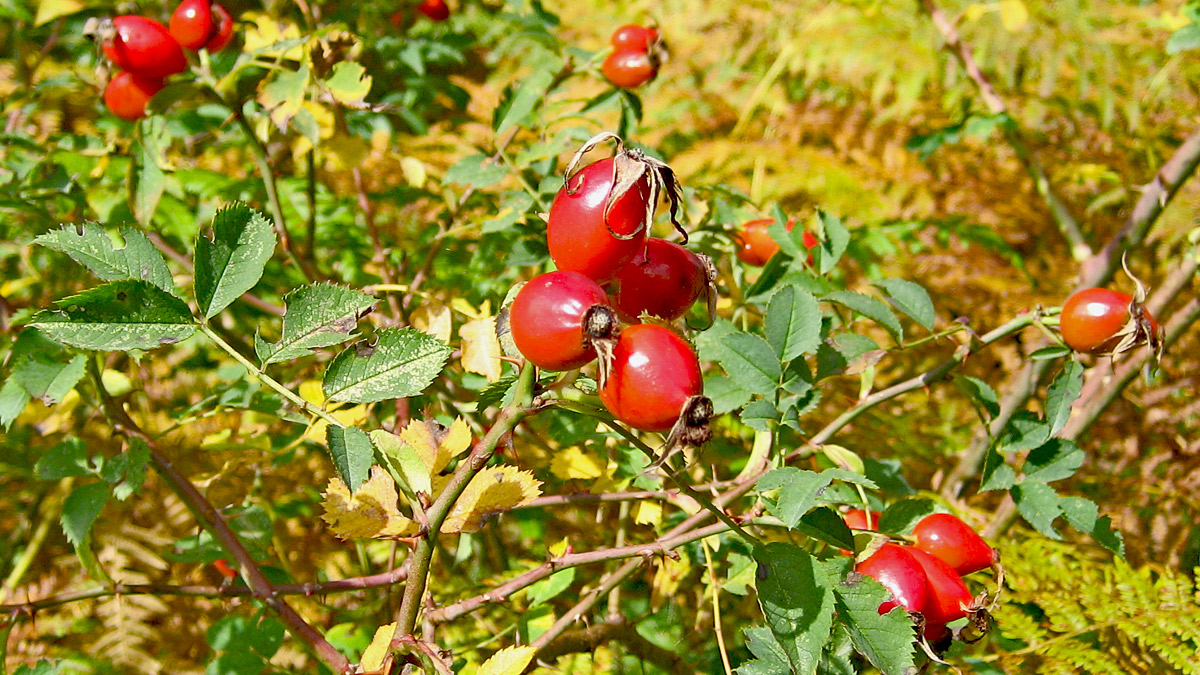 hier die reifen Früchte (Hagebutte) vermutlich der Gebirgs-Rose (Rosa pendulina)