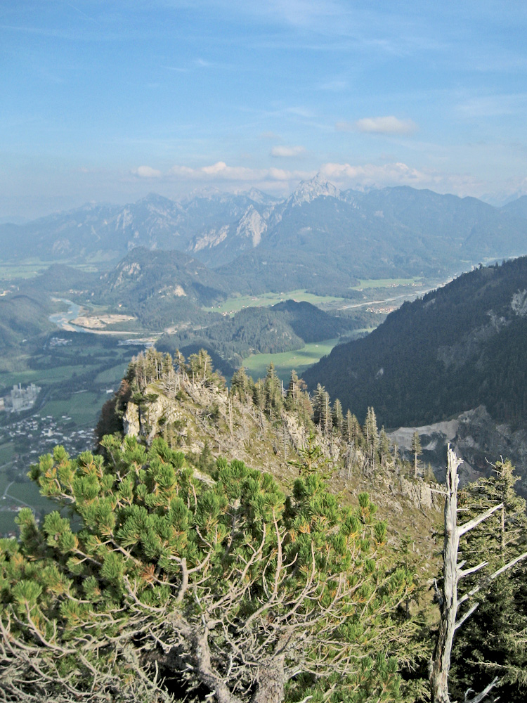 Gipfelblick vom Roten Stein hinab nach Vils und den Ostgrat - im Hintergrund der Lech bei Pinswang