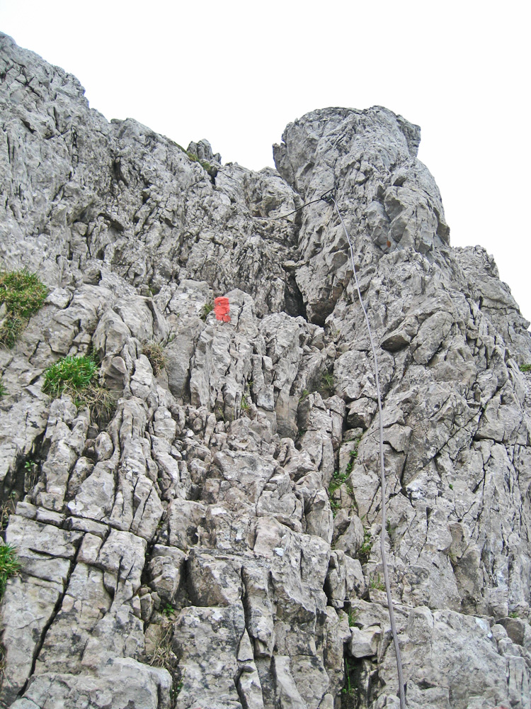 klettersteigähnlich führt der versicherte Steig sehr steil über die Kante empor zum schmalen Grat und dem Gipfelkreuz des Kleinen Daumens