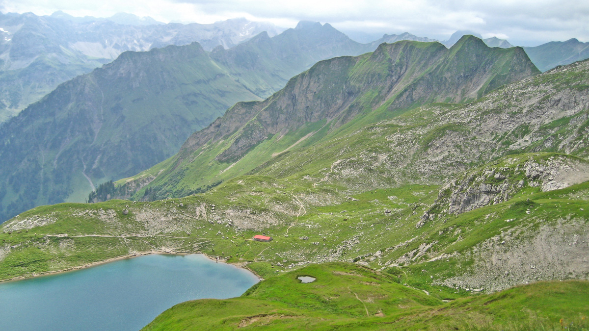 Ausblick vom Türle hinunter zum Engeratsgundsee mit der Seehütte - im Hintergrund rechts die Laufbichlkirche und links der langgezogene Grat zwischen Giebel und Laufbacher Eck