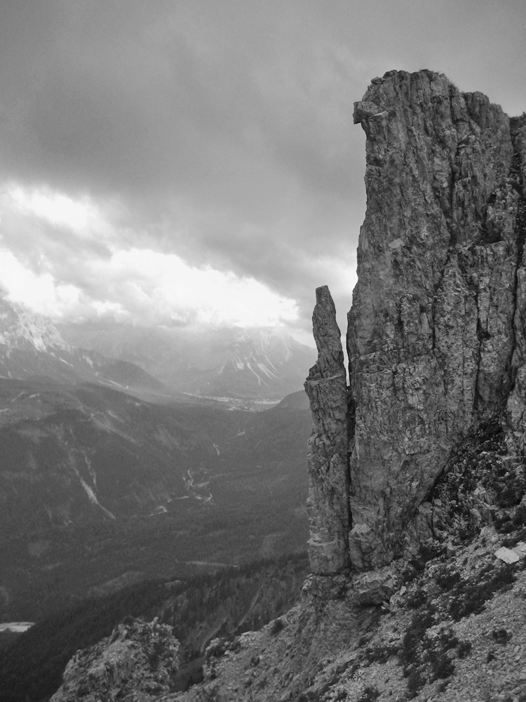 eine auffällige Felsformation im Gipfelbereich der Schellschlicht - im Hintergrund das Tal der Loisach und das sich öffnende Ehrwalder Becken