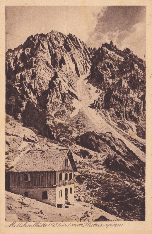 Die Muttekopfhütte auf einer Aufnahme von etwa 1925. Die zweitälteste der Alpenvereinshütten im Forumsgebiet wurde bereits im Jahre 1874 an heutiger Stelle errichtet.