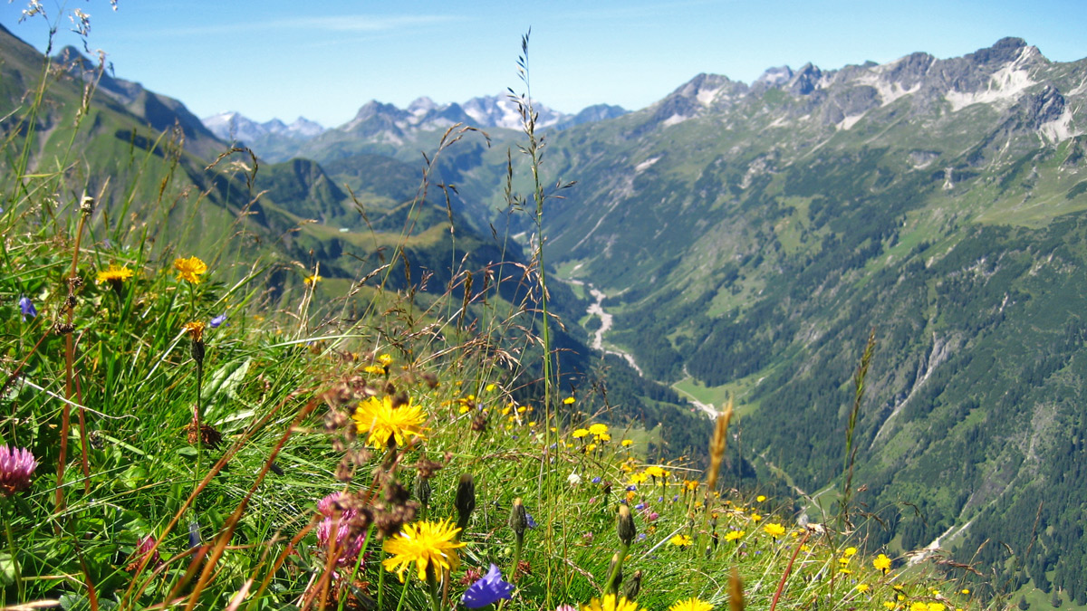 eine bunte Blumenwiese am Wildengundkopf bietet einen attraktiven Ausblick hinab in das Rappenalpental