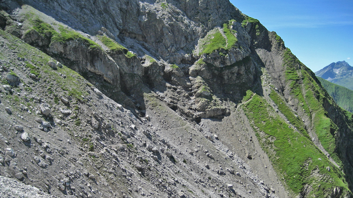 der Steig vom Wildengundkopf in Richtung Waltenberger Haus ist hier in mäßig gutem Zustand - in den Tobeln hat das Regenwasser den Steig aus den Flanken gewaschen - konzentriertes Gehen ist Pflicht!