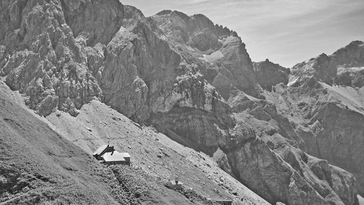das Waltenberger Haus wie es bis 2015 bestand - die Wahl des Hüttenplatzes mutet schon recht abenteuerlich an