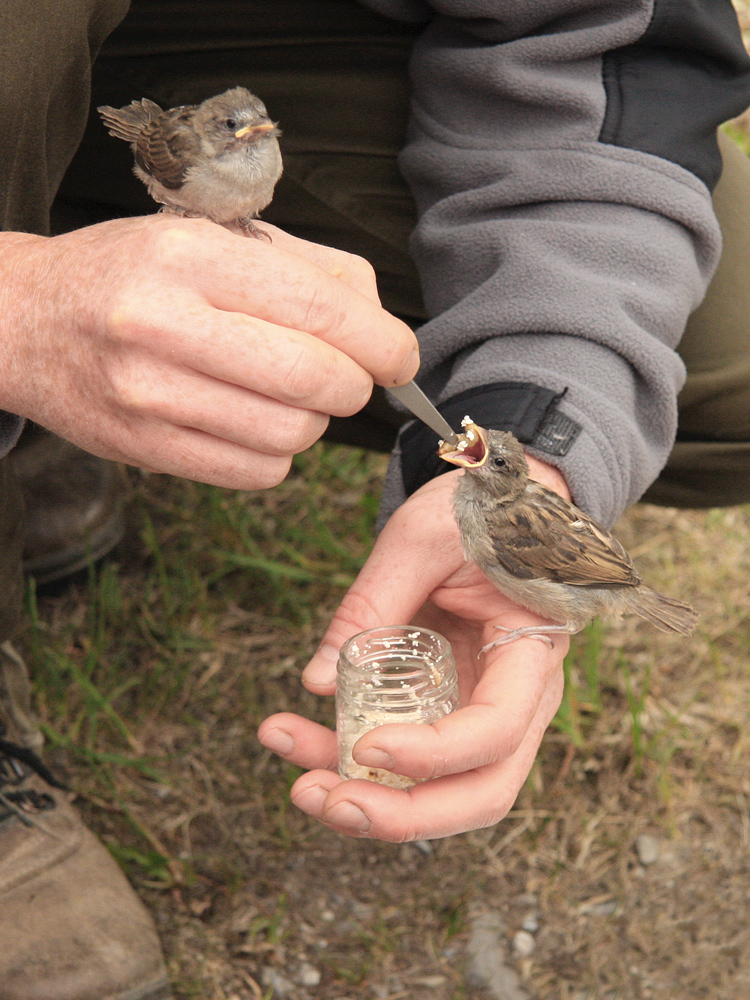 diese beiden Sperling-Jungtiere werden von Hand aufgezogen