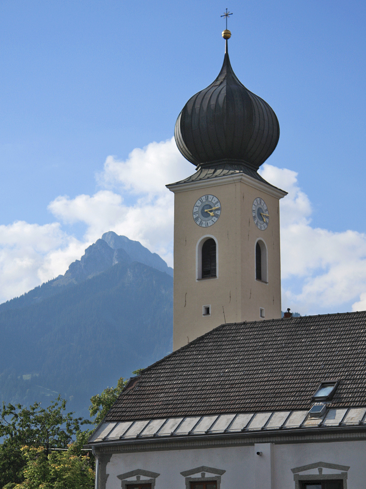 der Kirchturm der Reuttener Pfarrkirche Sankt Anna aus der Schulstraße gesehen - im Hintergrund die Gehrenspitze
