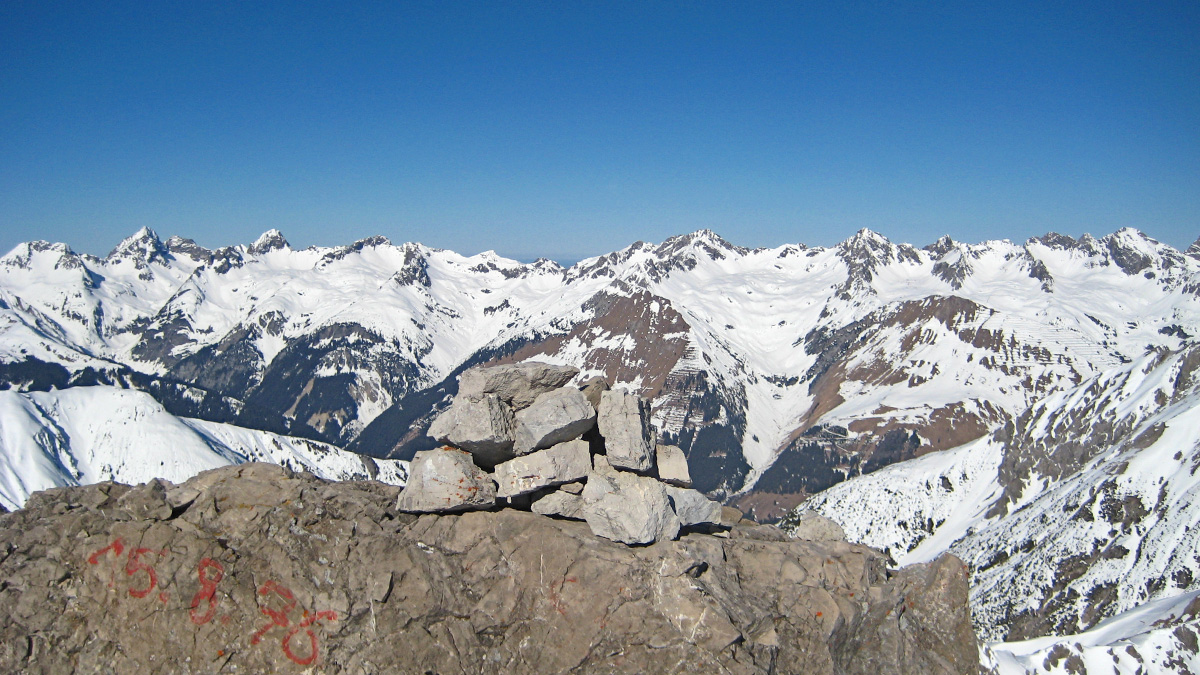 Gipfelblick von der Großen Schafkarspitze in den Lechtaler Alpen hinüber zu der Hornbachkette in den Allgäuer Alpen