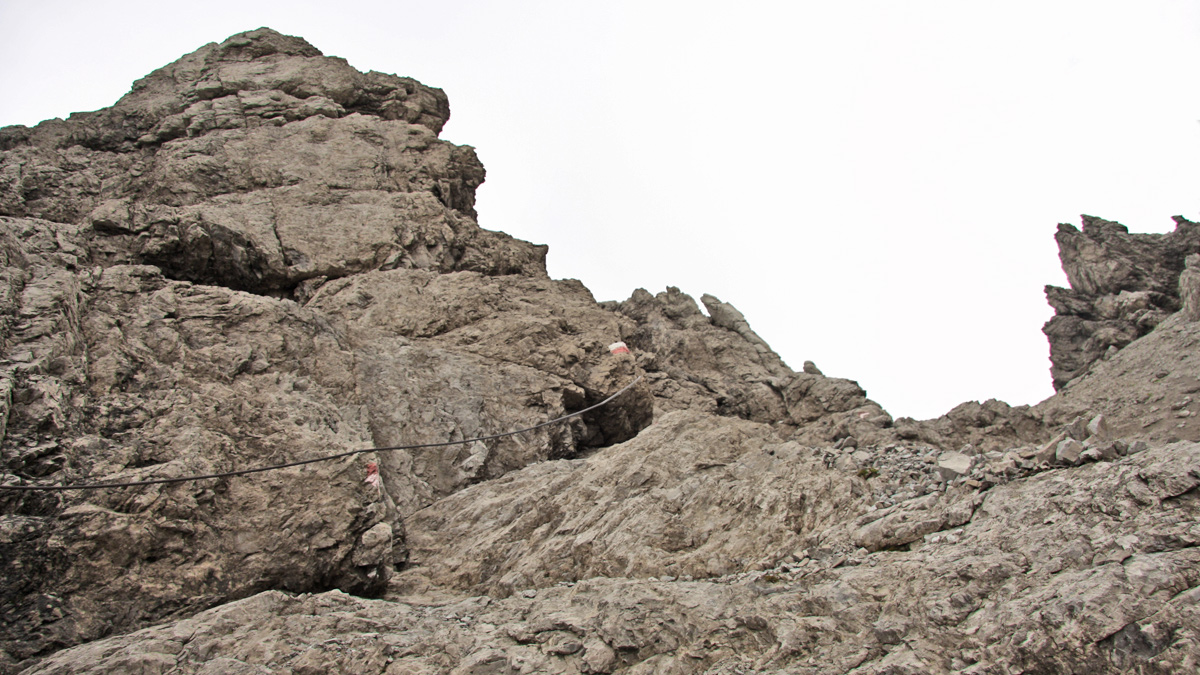 über eine seilgesicherte Felsstufe steigt man hinauf in den Scharnitzsattel - dem Übergang vom Hahntennjoch in das Scharnitzkar (Muttekopfhütte)