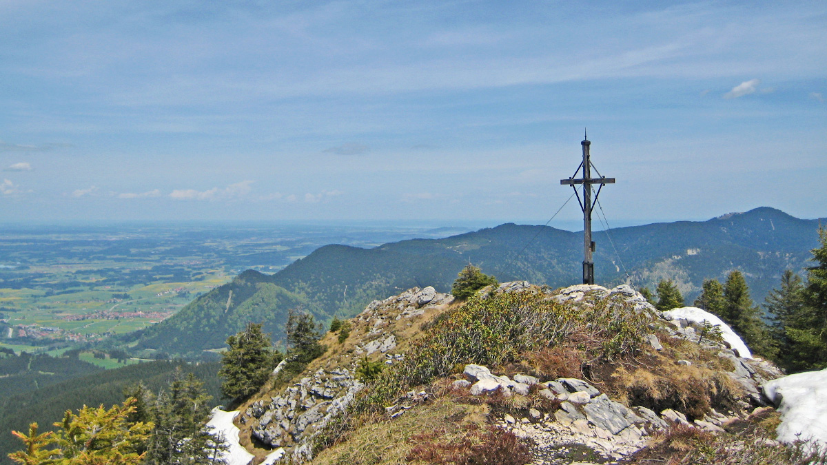 am Gipfel des Schönleitenschrofen - mit Blick auf Halblech und die waldreichen Trauchberge