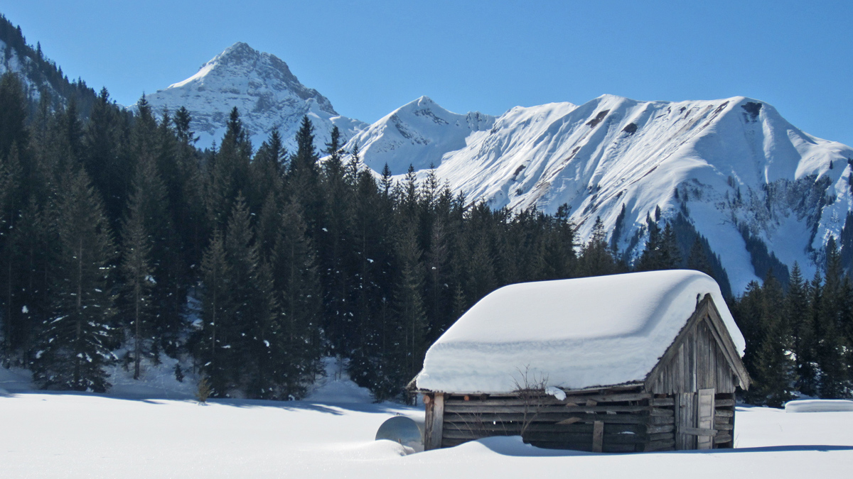 ein Heustadel in den Feldern zwischen Kelmen und Namlos - im Hintergrund die Namloser Wetterspitze und der nach Norden vorspringende Bergrücken 'Am Joch'