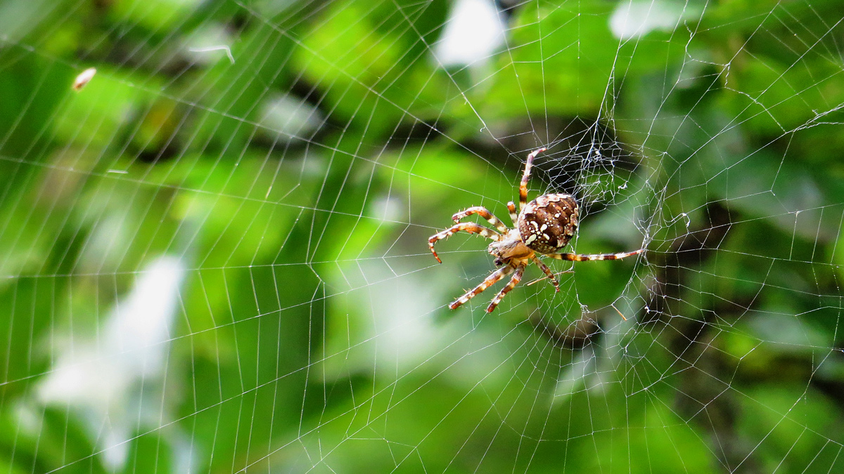 eine Kreuzspinne bei der Reparatur des Netzes
