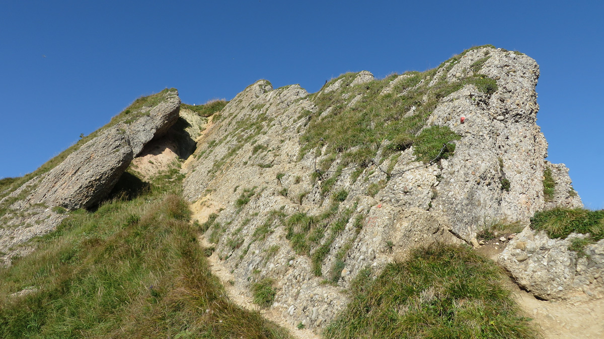 die seilversicherte Nagelfluh-Rippe am Stuiben-Ostgrat