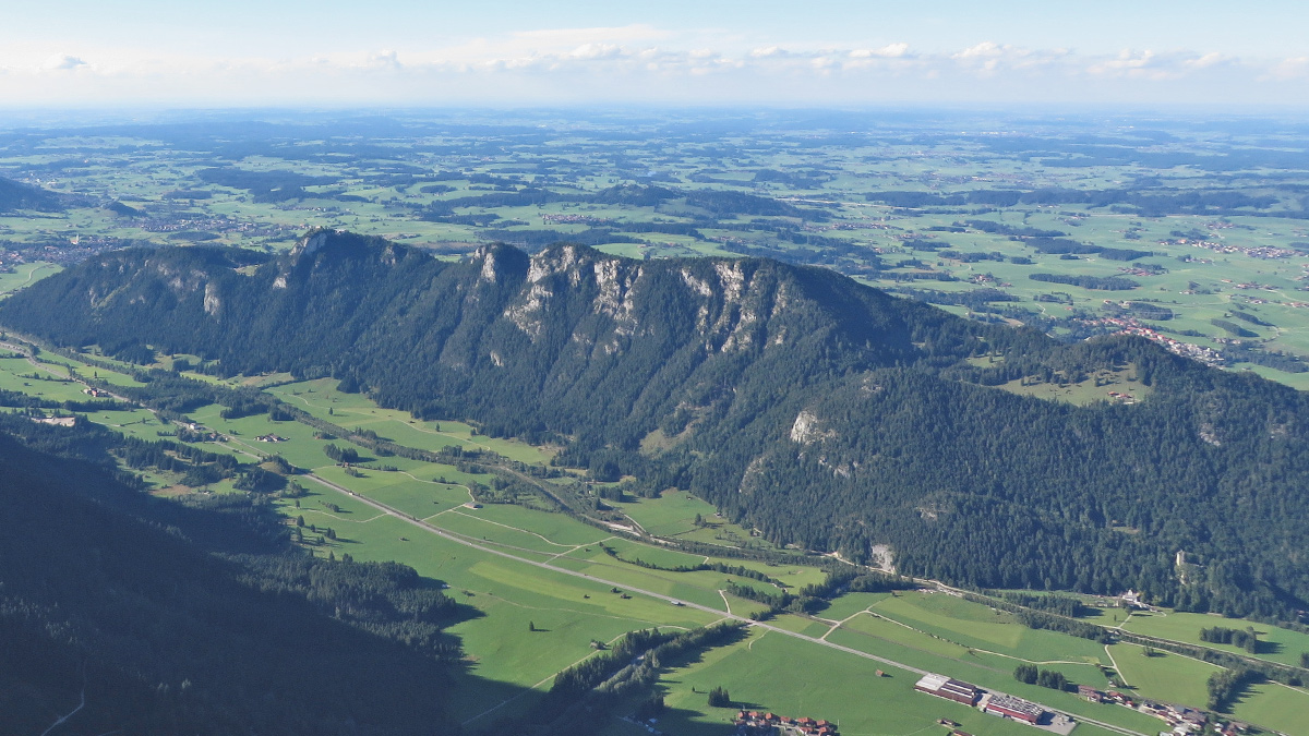 der den Tannheimer Bergen vorgelagerte Zirmgrat zwischen Pfronten und Vils mit der Salober Alm (re.)