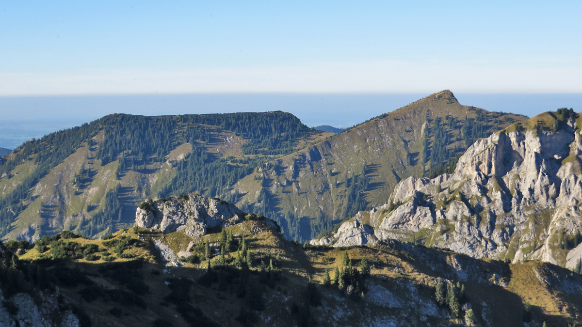 das Schlössel - ein kurzer Felsgrat nördlich der Weitalpspitze - im Hintergrund (v.l.) der Firstberg, der Grubenkopf und der Vorderscheinberg