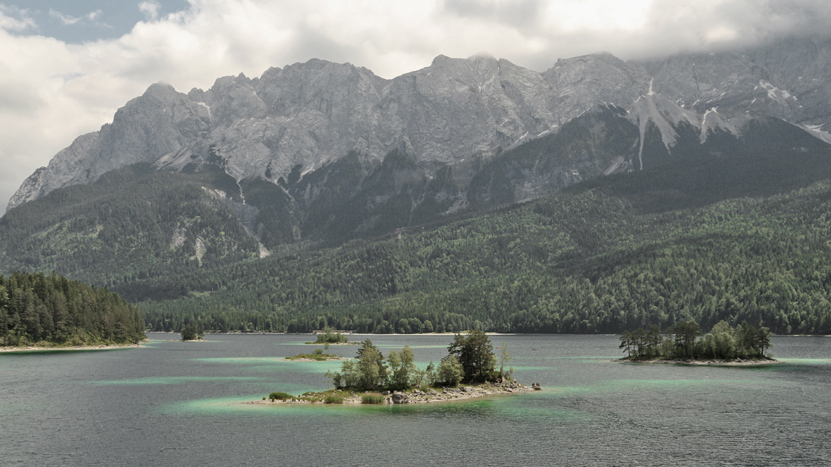 Blick über den Eibsee hinauf zu den Waxensteinen