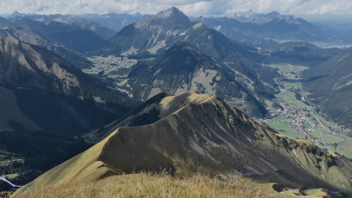 der langgezogene Grat von der Pleisspitze über das Mähbergjoch hinaus zum Gartigköpfl (Mühlwaldköpfl) - im Tal ist Berwang (li.) und Bichlbach zu sehen