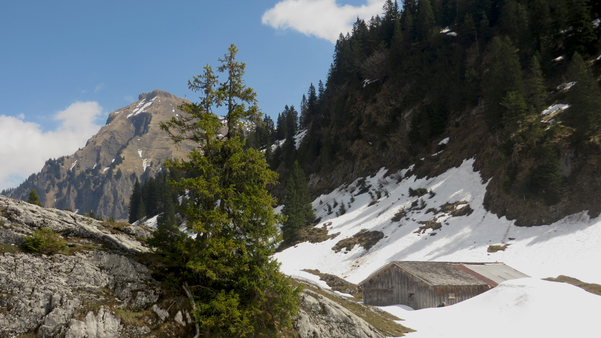 die Untere Sattelalpe auf dem Weg zum Gipfel der Mittagsfluh - im Hintergrund der Gipfel des Diedamskopfes