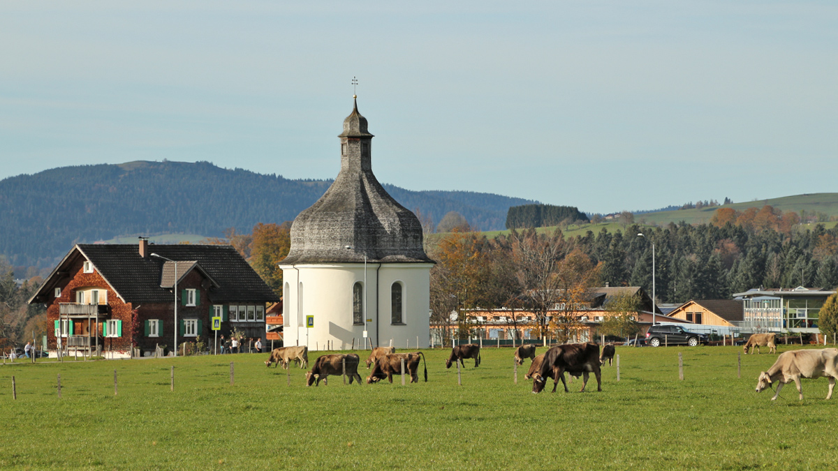 die auffällige, barocke Kapelle St. Anna auf dem Felde bei Lingenau