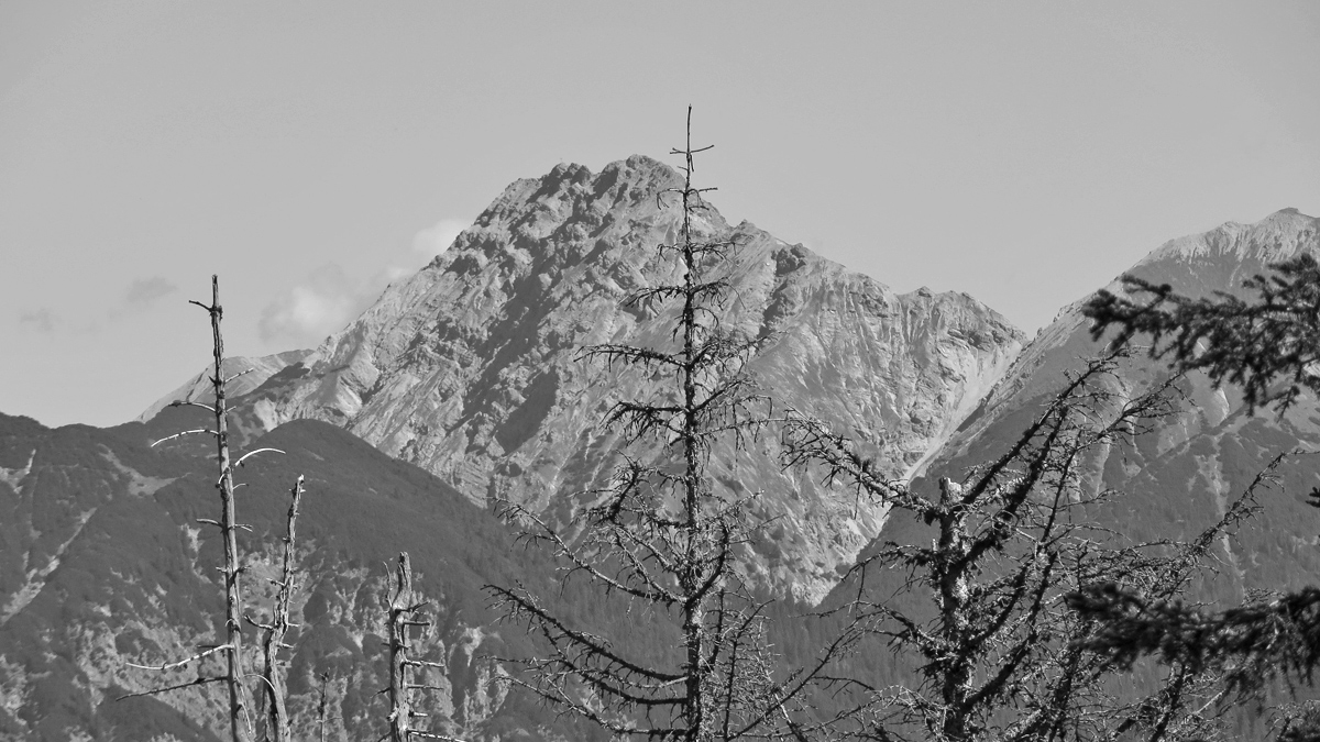die charakteristisch gebänderte Westflanke der Kreuzspitze