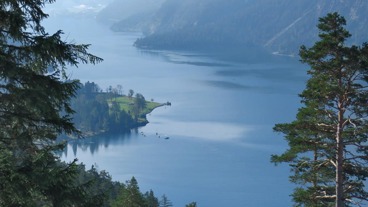 Blick auf den Seehof am Achensee während des Anstieges zur Köglalm