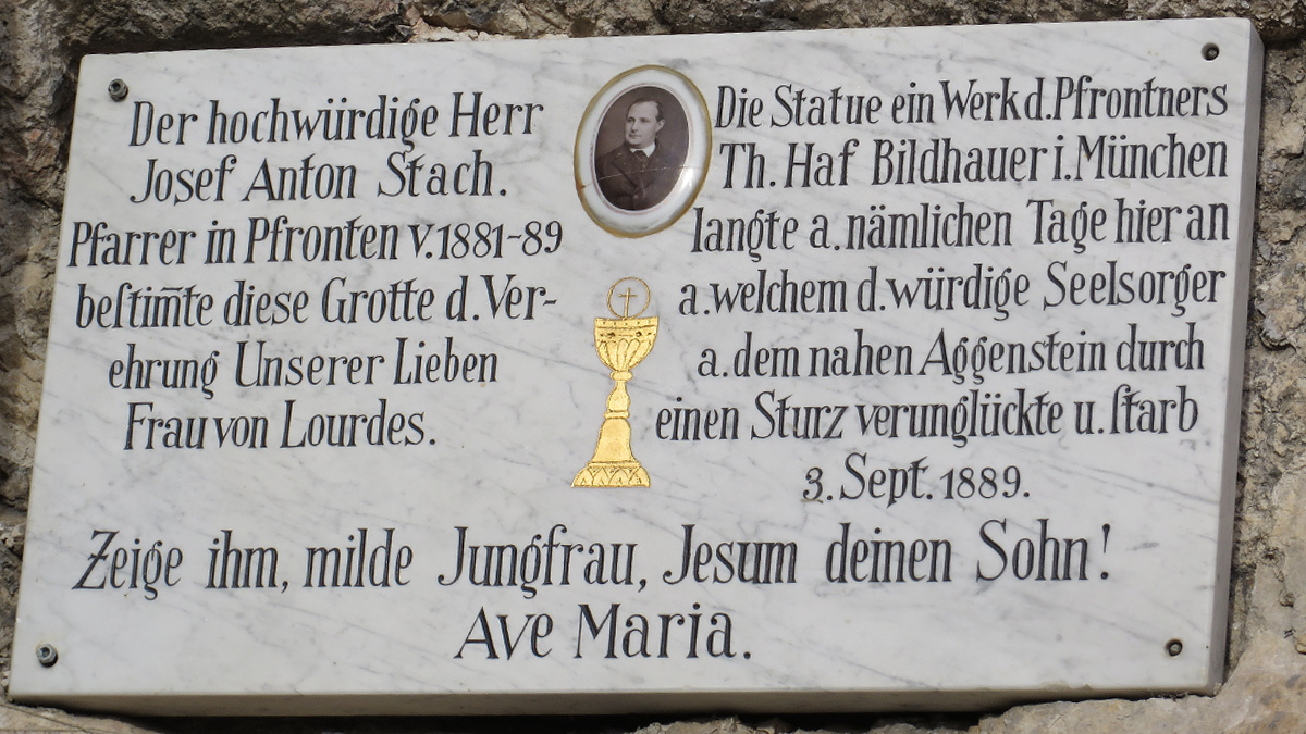 eine tragische Begebenheit begleitet die Mariengrotte - die Marienstatue wurde am selben Tag von Pfronten herauf geschafft, als auch der Initiator und Pfarrer von Pfronten - Josef Anton Stach - am 3. September 1889 am Aggenstein abstürzte und tödlich verunglückte