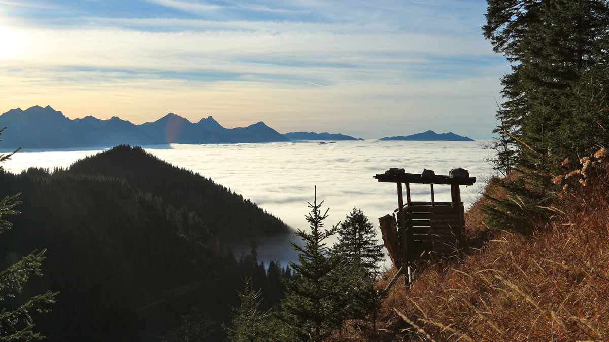 der Jägerstand am Pechkopf mit Blick auf den benachbarten Rohrkopf über dem Nebelmeer