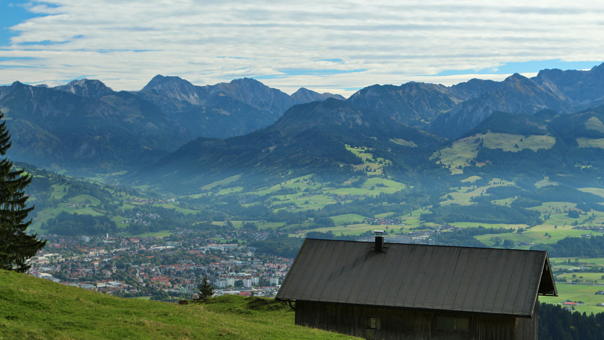 der Weg führt vorbei am Käser in Richtung Mittag - der Blick geht zurück über das Illertal und Sonthofen hinweg zu den Allgäuer Bergen rechts der Iller