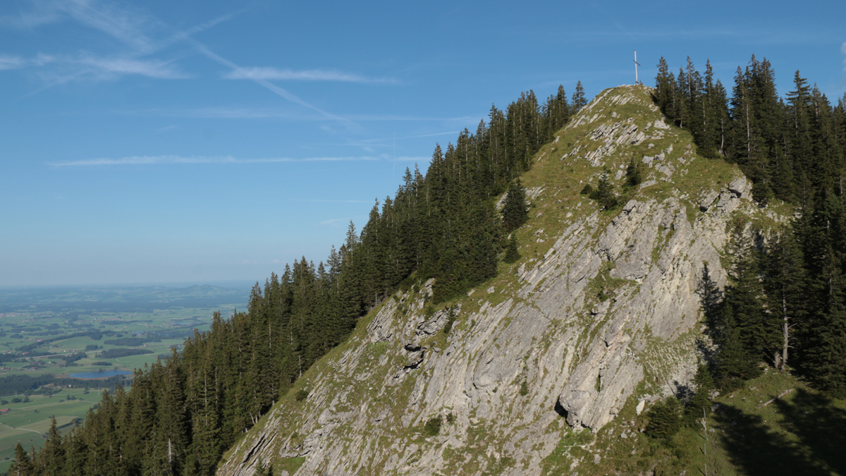 Blick von der Hütte am westlichen Vorgipfel hinüber zu der Alpspitze und ihrer waldreichen Nordflanke