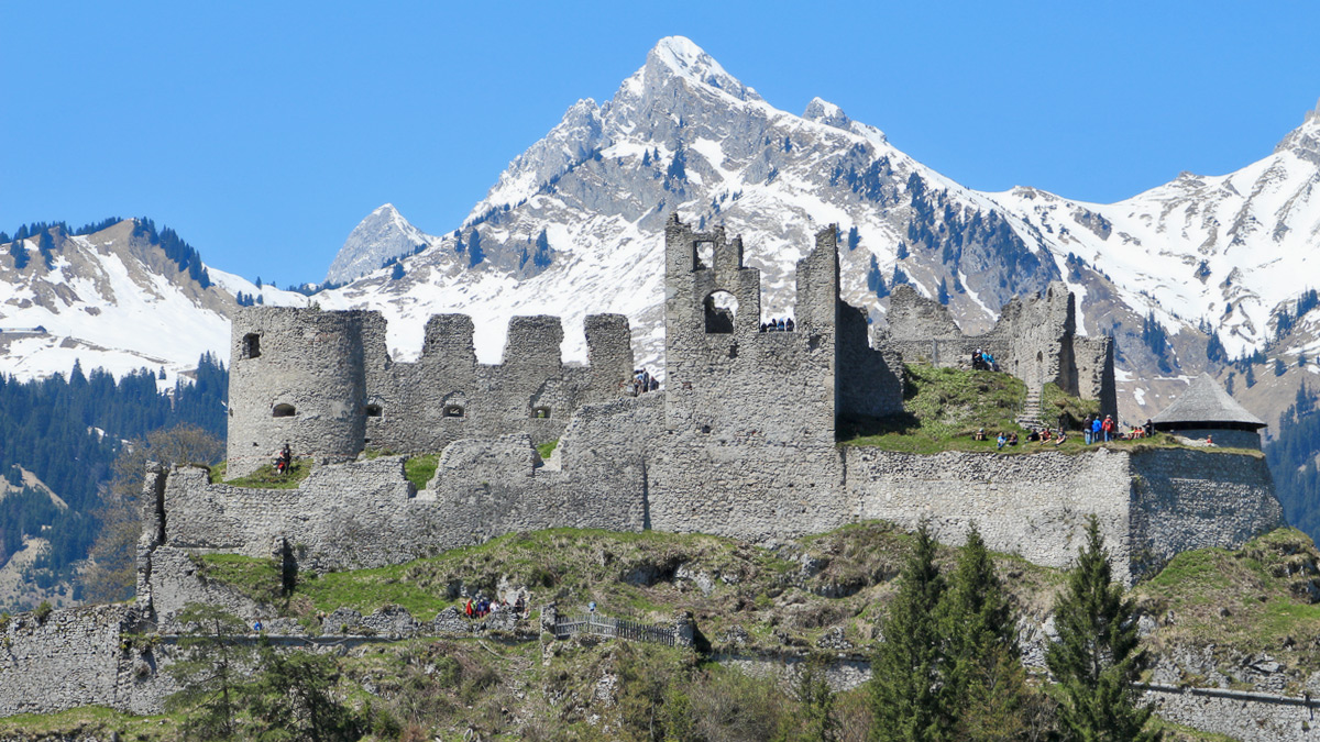 die Ruine Ehrenberg vor der Kulisse der Tannheimer Berge