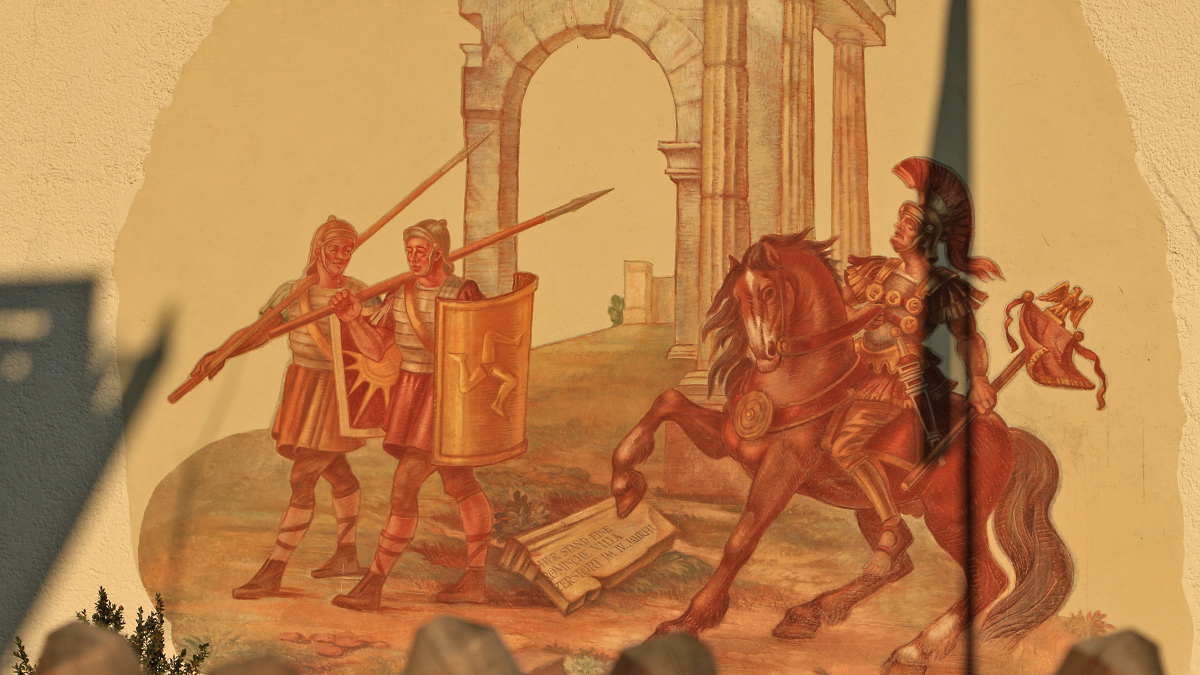 an einer Fassade im Füssener Ortsteil Bad Faulenbach - auf einer Tafel steht: hier stand eine prunkvolle römische Villa, die zur Zeit der Alemannenstürme im Jahre 2-300 nach Christi zerstört wurde