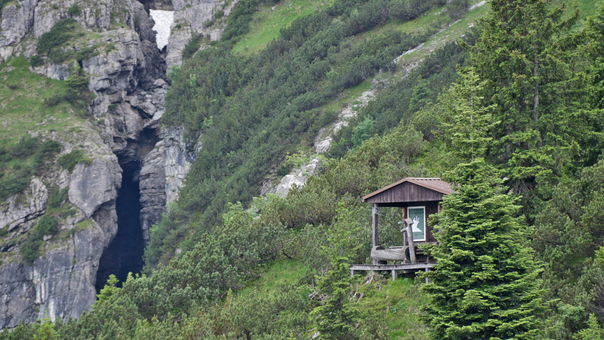 die Jagdhütte an der beeindruckenden Kluft am Schneeplatz unterhalb der Thaneller-Nordostwand
