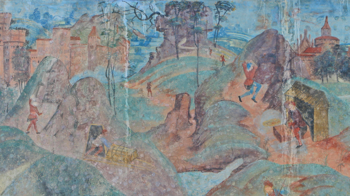 eine Bergwerkszene an der Langhaussüdwand der Außenfassade der Stadtpfarrkirche Imst aus dem 15. Jahrhundert