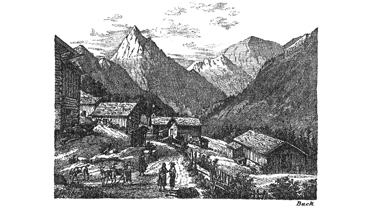 zeitgenössische Ansicht des Oberstdorfer Weilers Gerstruben mit der markanten Gipfelgestalt der Höfats - aus 'Geschichte des Allgäus' - Zeichnung nach Buch; Baumann 1883