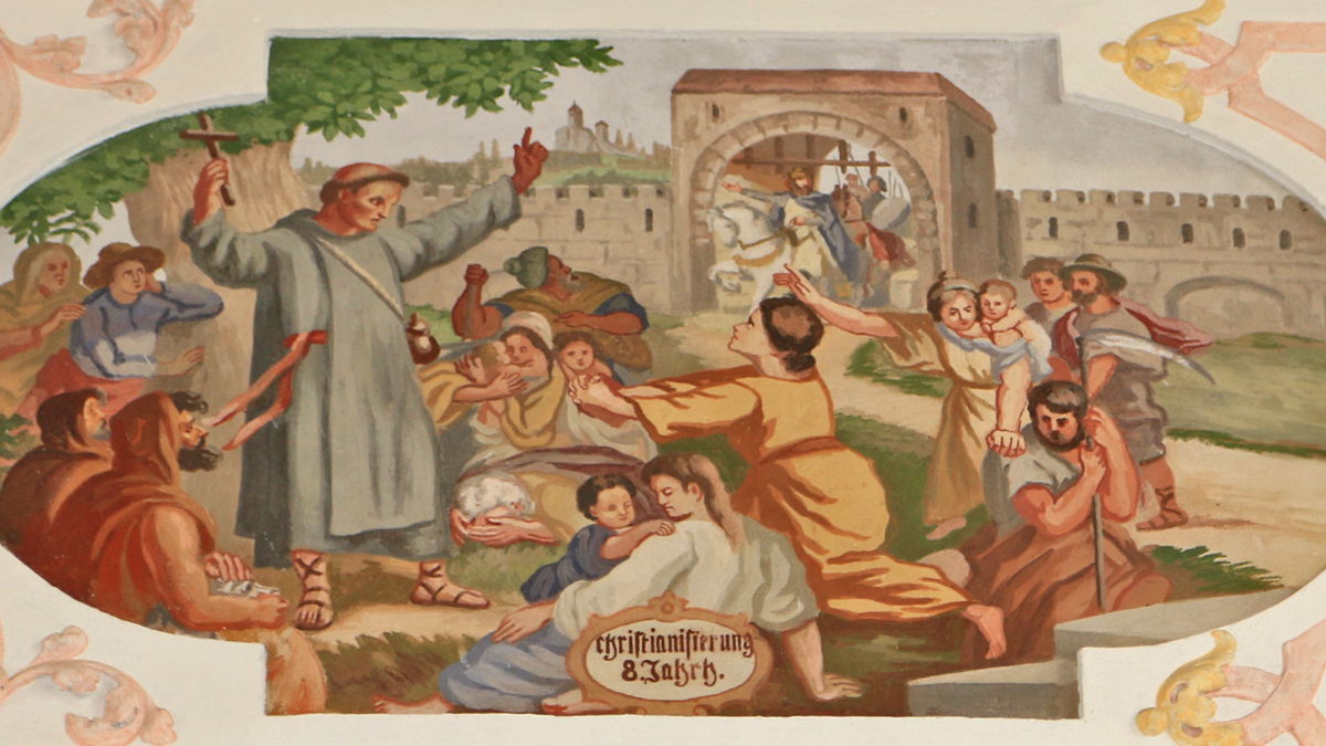 die einsetzende Christianisierung unter den Franken am Fuße des Auerbergs - Abbildung an der Orgelempore der Kirche St. Nikolaus in Bernbeuren
