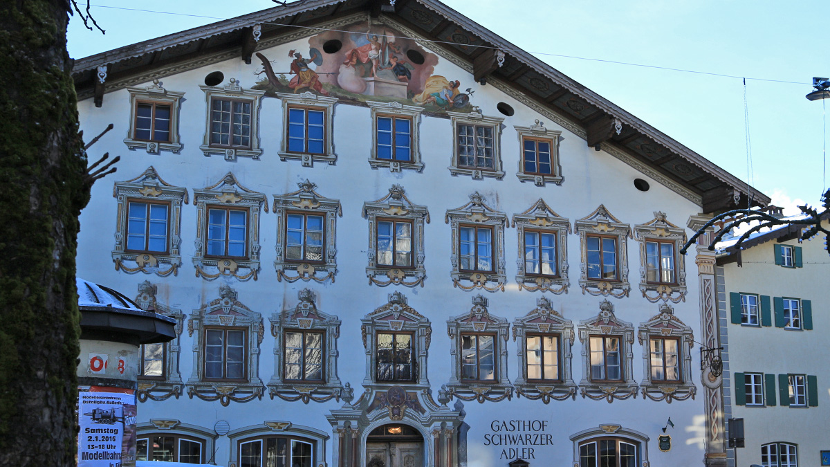im Kern schon vor 1471 entstand hier der nachmalige Gasthof Schwarzer Adler im Reuttener Obermarkt - die Fassadenmalerei von 1800 stammt von dem Höfener Joseph Anton Köpfle