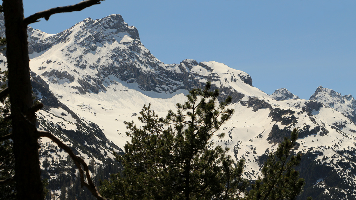 die Gliegerkarspitze mit der plattig gegen Norden (im Bild rechts) abfallenden Schießmauer