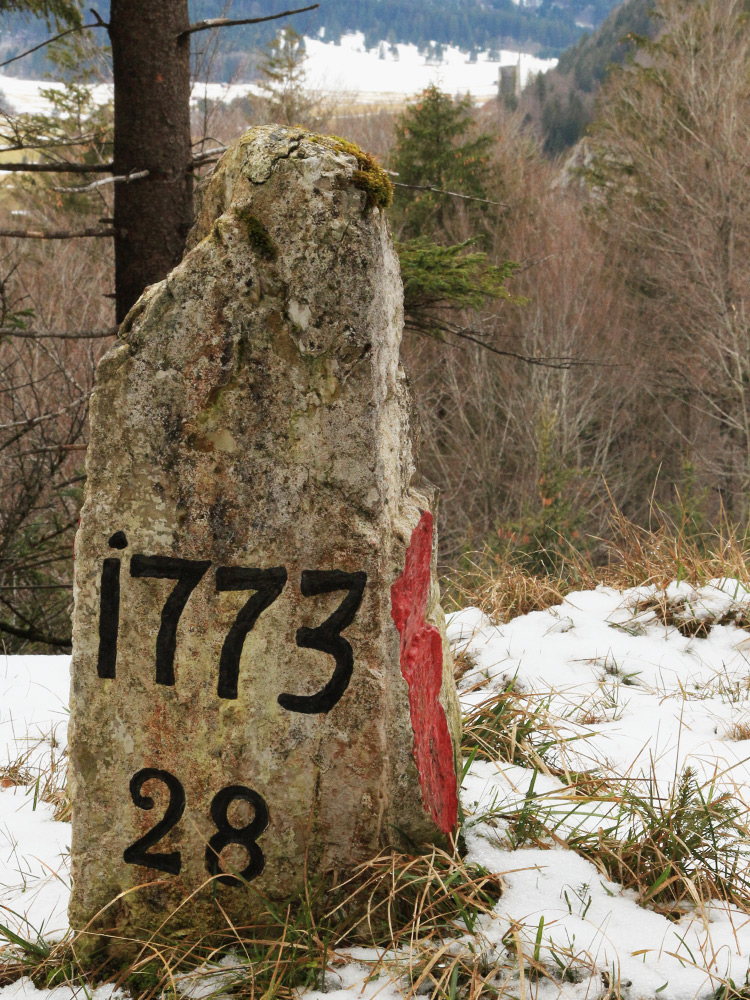 der Grenzstein am westlichen Ende des Vilser Berges unweit der Scharte - im Hintergrund die Burgruine Vilsegg