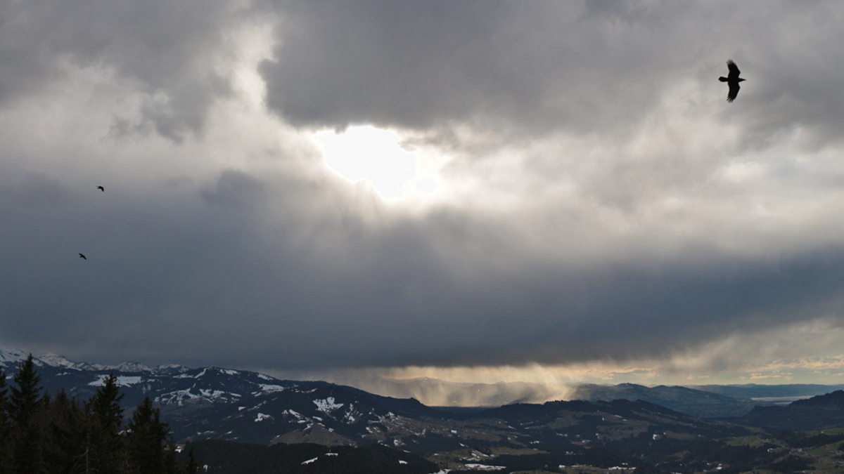 das Wetter schlägt um - der Gipfel des Koyensteins präsentiert sich in einem mystischen Licht. Rund um den Koyenstein geben die Raben ihre flugakrobatischen Künste zum Besten
