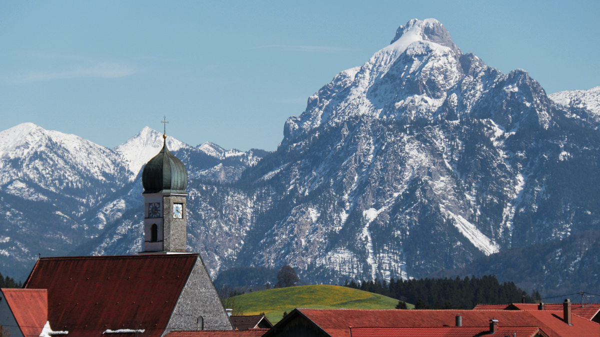 der Turm der Maria Hilf Kapelle in Speiden mit dem Säuling im Hintergrund