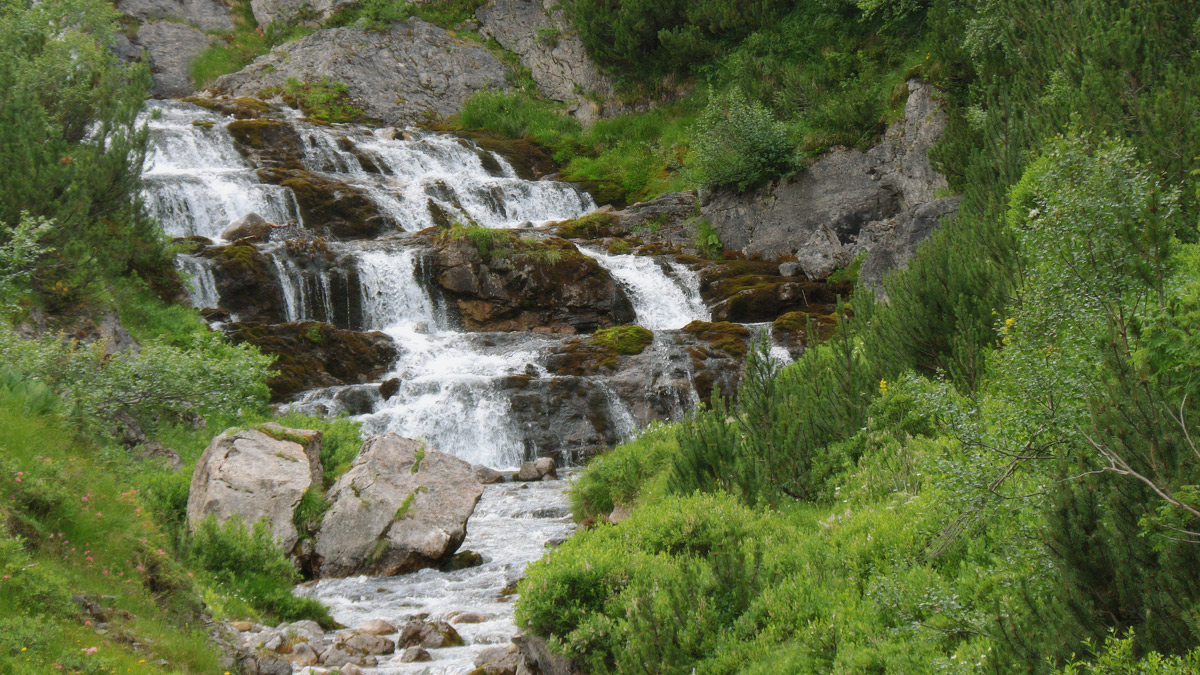 ein über mehrere Stufen stürzender kleiner Wasserfall am Verlauf des Lechwegs im Tal des Formarinbaches