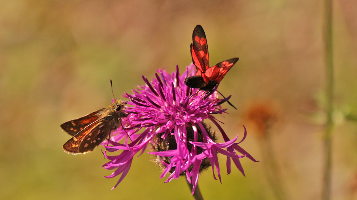 ein Gelbwürfeliger Dickkopffalter (Carterocephalus palaemon) und ein Sechsfleck-Widderchen (Zygaena filipendulae) auf einer Flockenblume