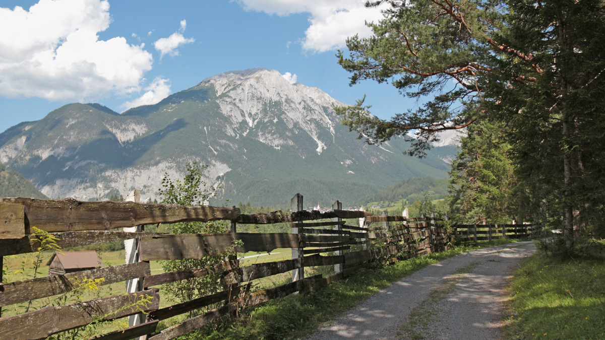 unterwegs auf der Via Claudia Augusta im Strader Wald (Gurgltal) mit dem Wannig im Hintergrund