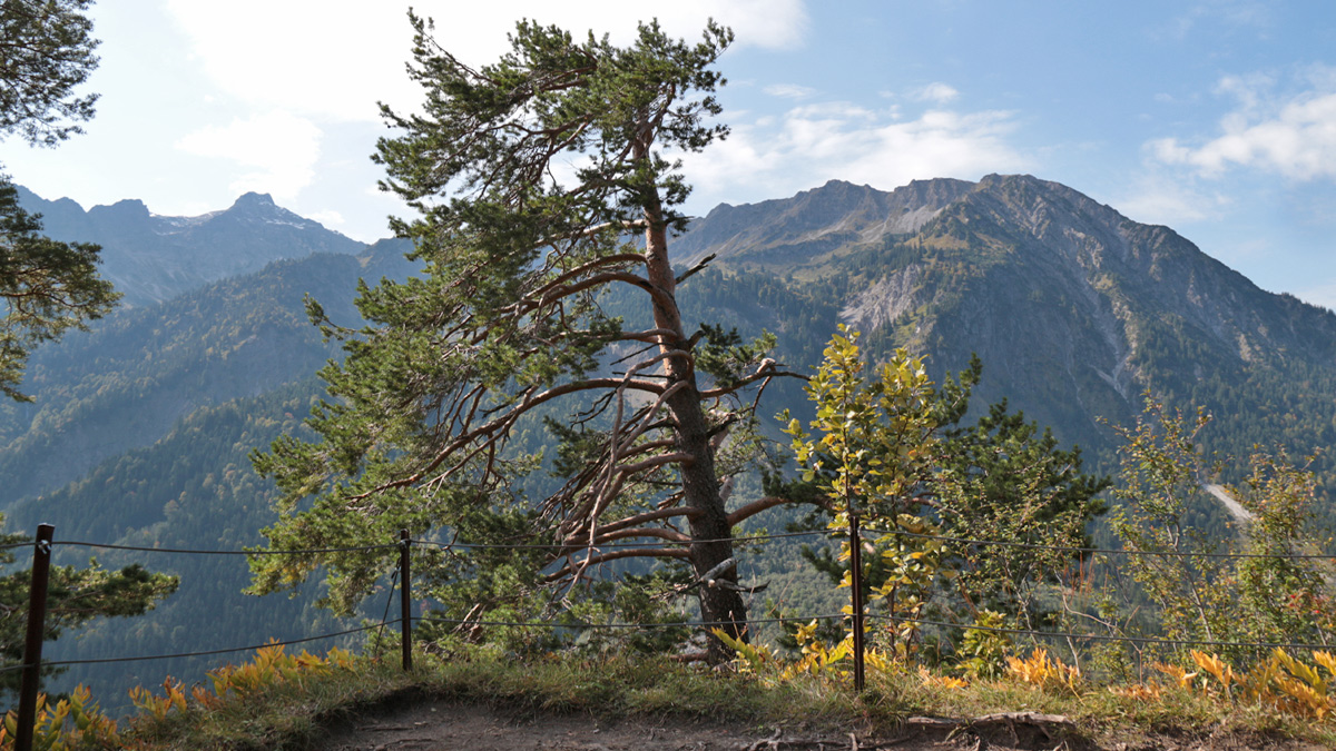 der Ausblick vom Köpfle oberhalb von Hinterstein auf Kleinen Daumen (li.) und Breitenberg