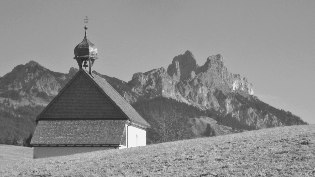 die Kapelle St. Leonhard bei Kienzen - im Hintergrund der Gimpel und die Rote Flüh