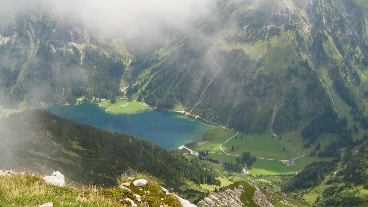 Gipfelblick vom Gaishorn hinab zum Vilsalpsee und der Vilsalpe (re. im Bild)
