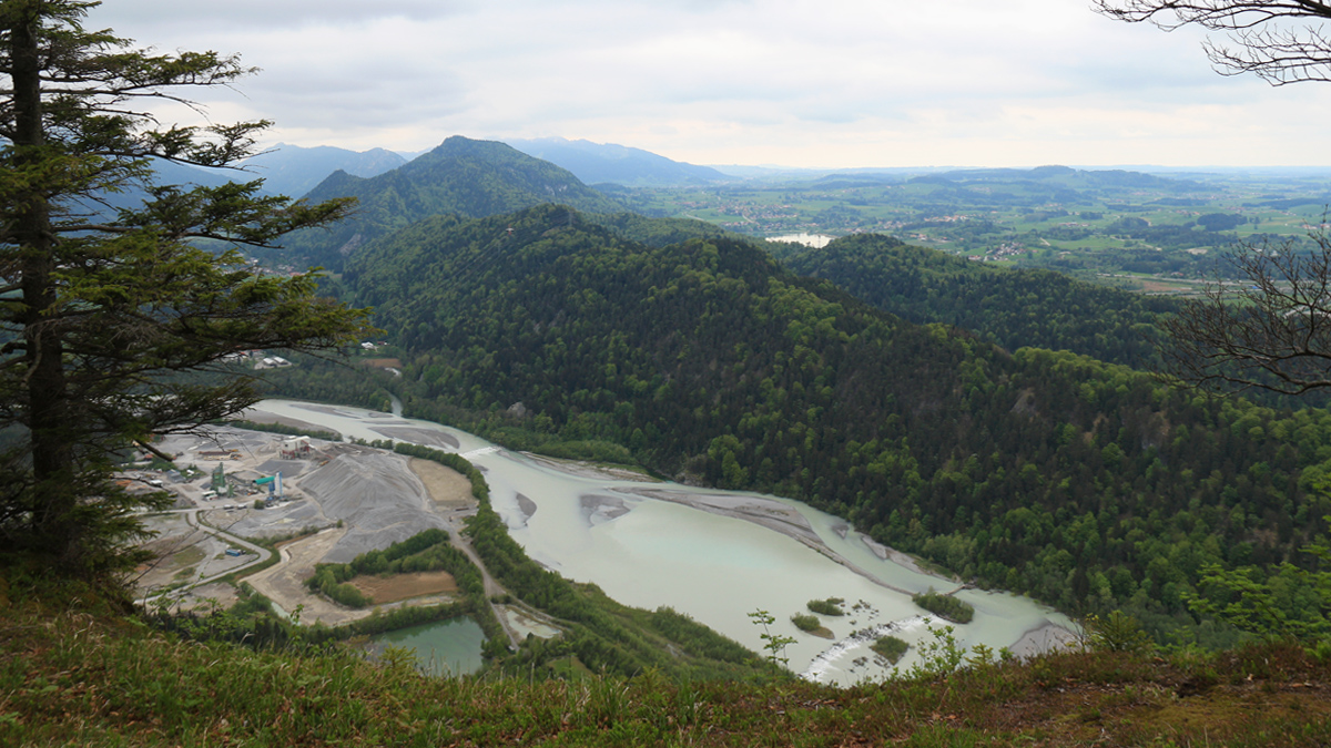der Lech bei dem Pinswanger Gewerbegebiet Weißhaus - im Hintergrund der Höhenzug des Falkensteins